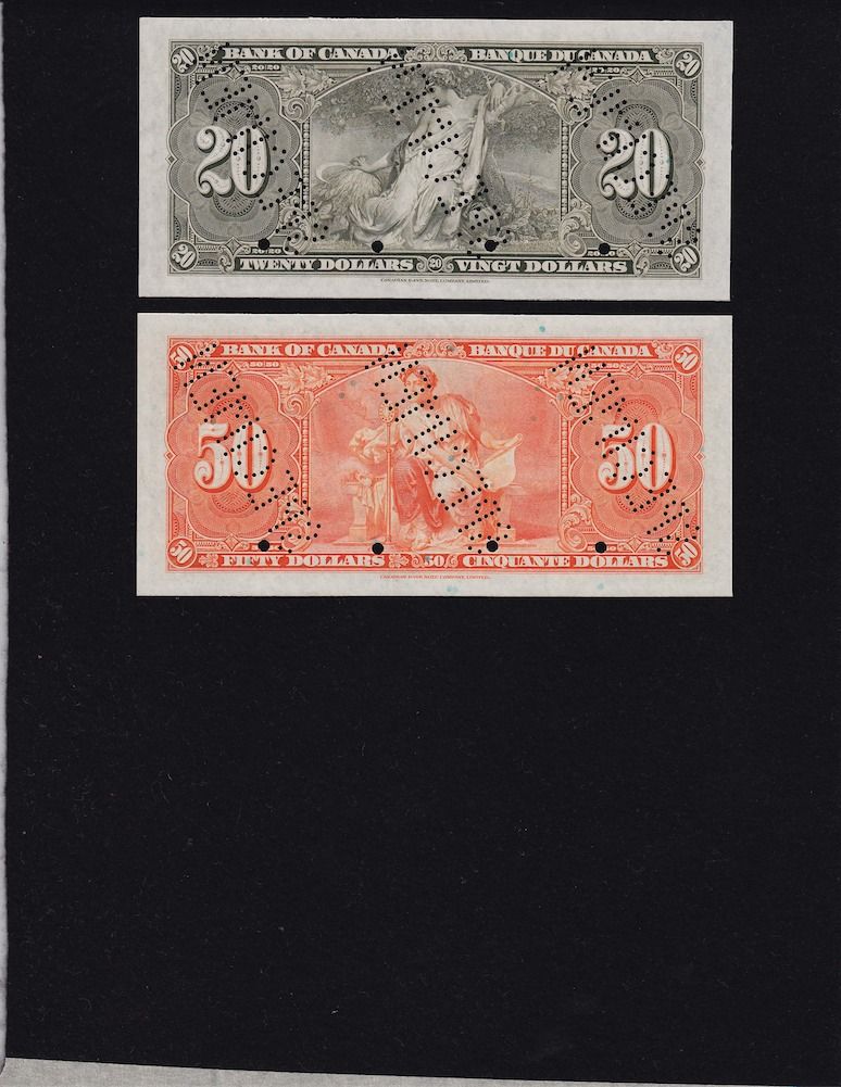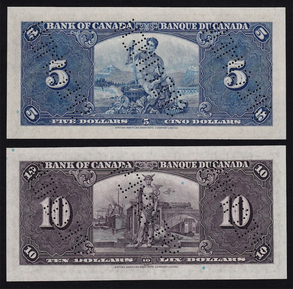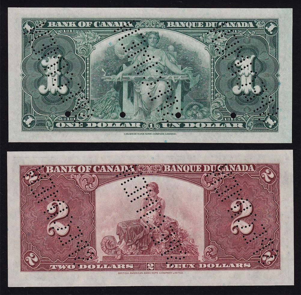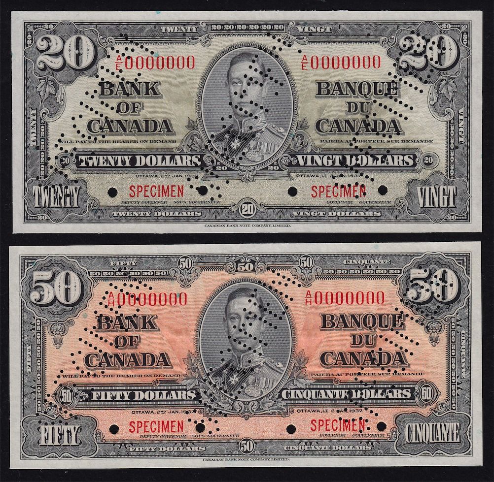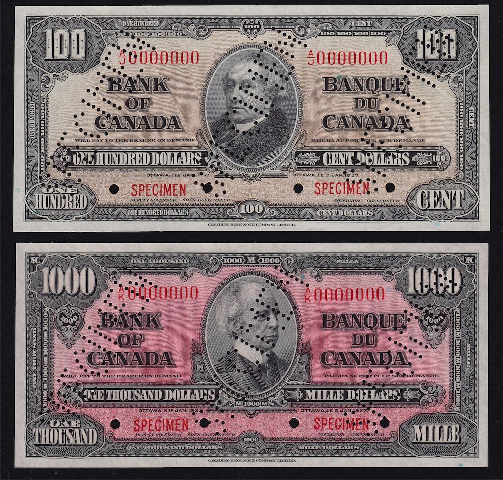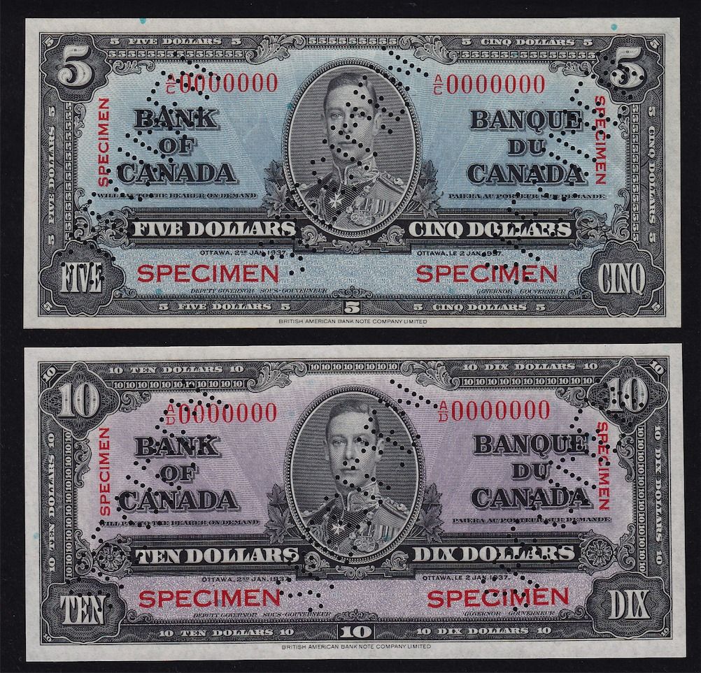 1937 Bank of Canada Specimen Set (Large Heading) - Perforated three times diagonally, these specimens are of choice quality with superb colours. this would make a perfect match to the 1935 set. This set includes $1-$1000 and maximum of 48 sets were sold by The Bank of Canada. 8 Pcs. Rare.