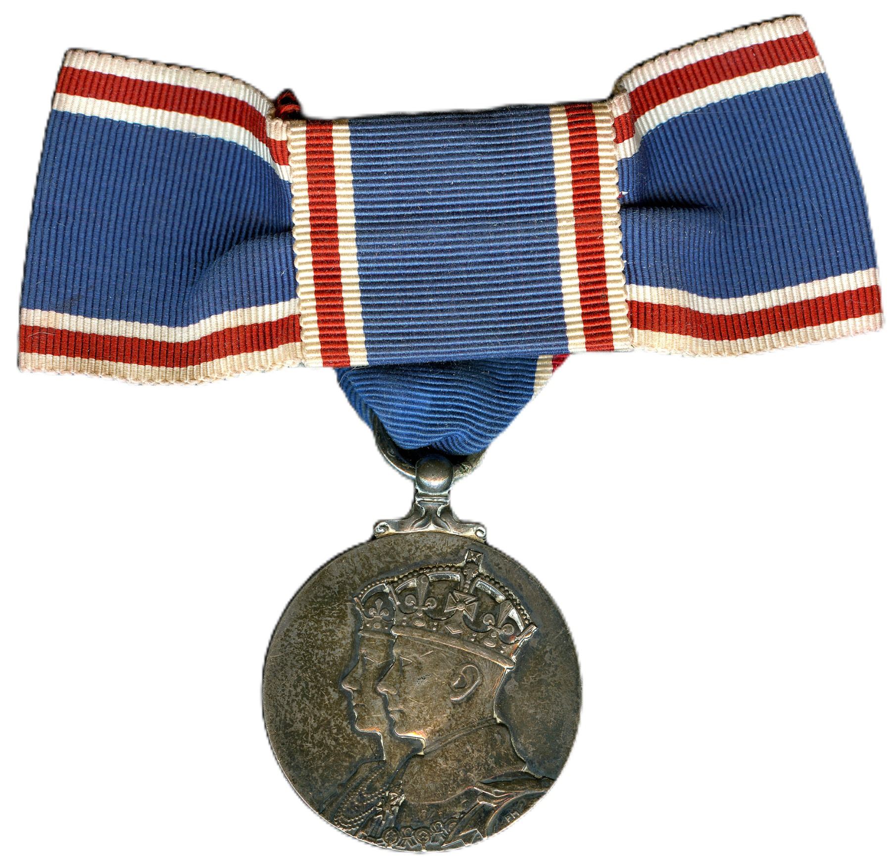 1937 Geo. VI Coronation Medal. Silver. Suspended from a red, white and blue bow tie ribbon. EF.