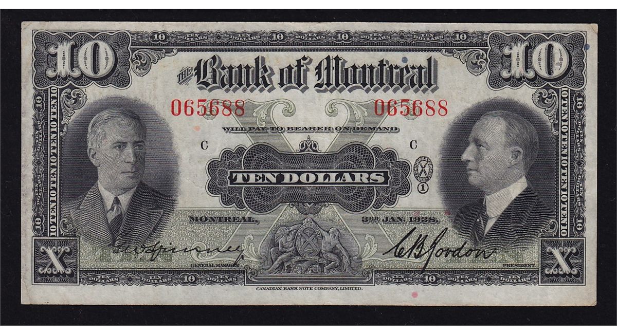 1938 Bank of Montreal $10 - CH 505-62-03, VF, pressed, S/N:065688/C.