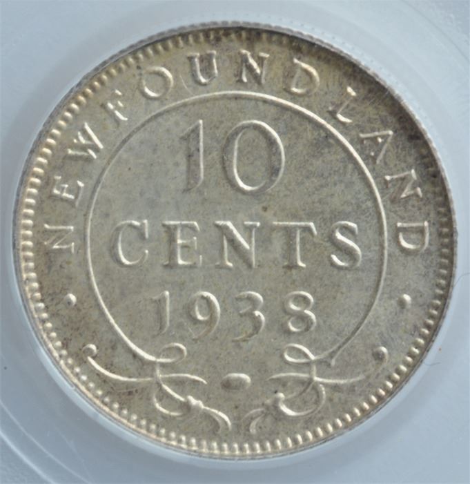 1938 Newfoundland Ten Cents - PCGS MS65. Untoned with bright, satin-finished frosty surfaces. This is the finest graded piece. (05/16).