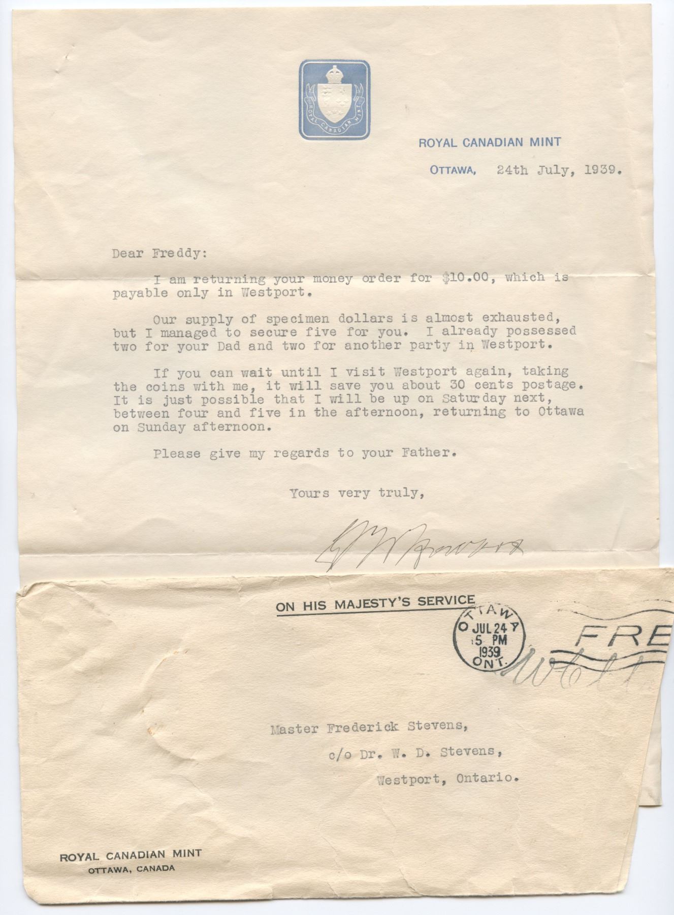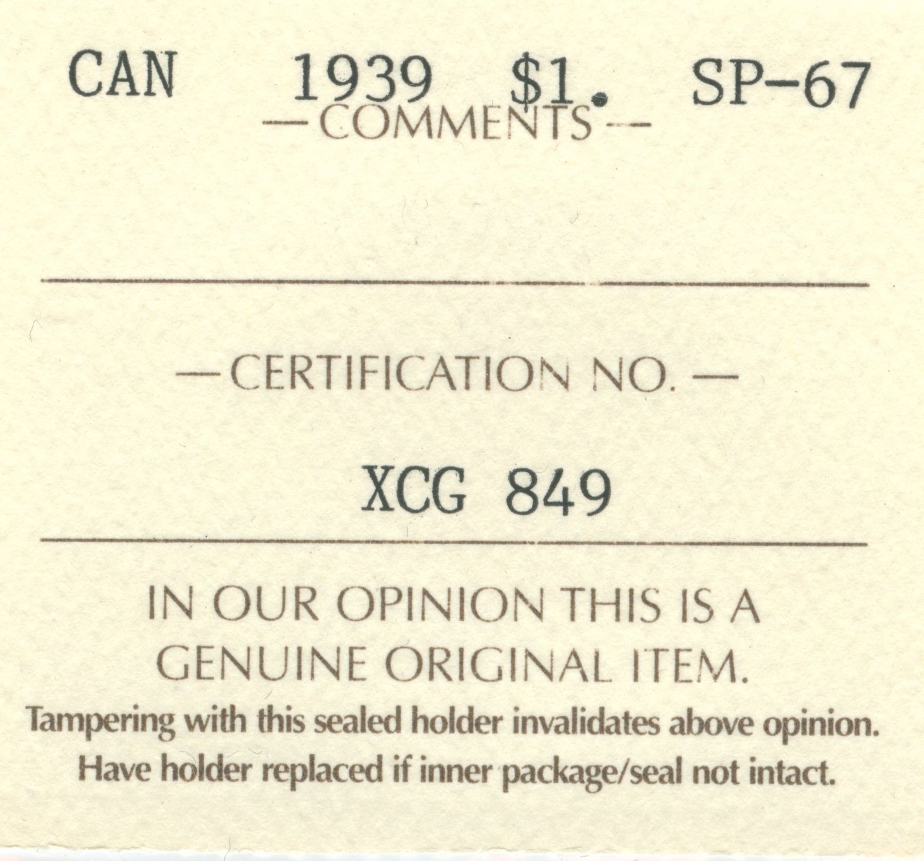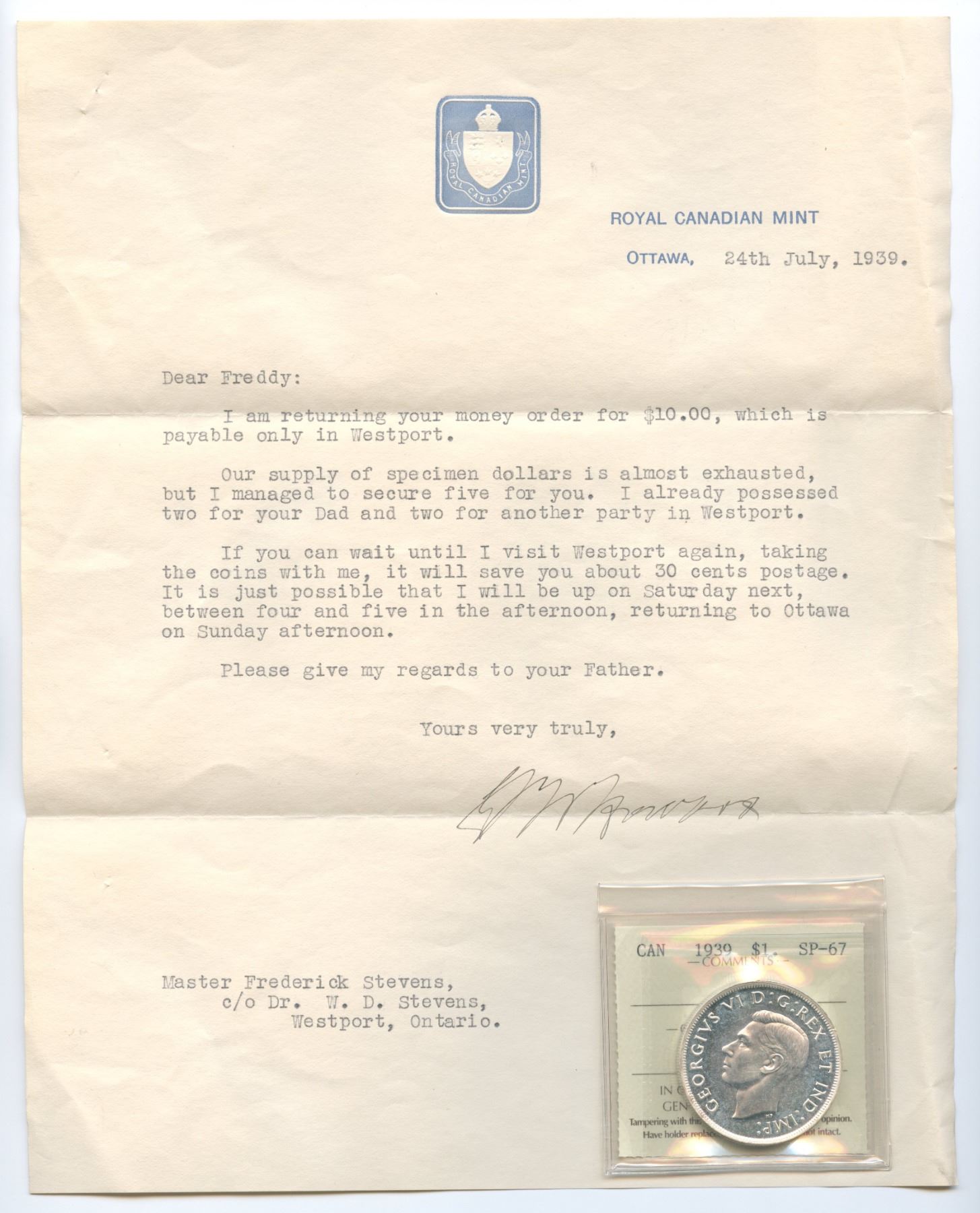 ICCS SP-67. A lovely Specimen Dollar punctuated by a hint of cameo. There are no exact mintage figures for the Royal Visit Specimen Dollars, but it is generally accepted that no more 35-40 pieces were struck. Accompanied by a letter from The Royal Canadian Mint, dated 24th July, 1939.