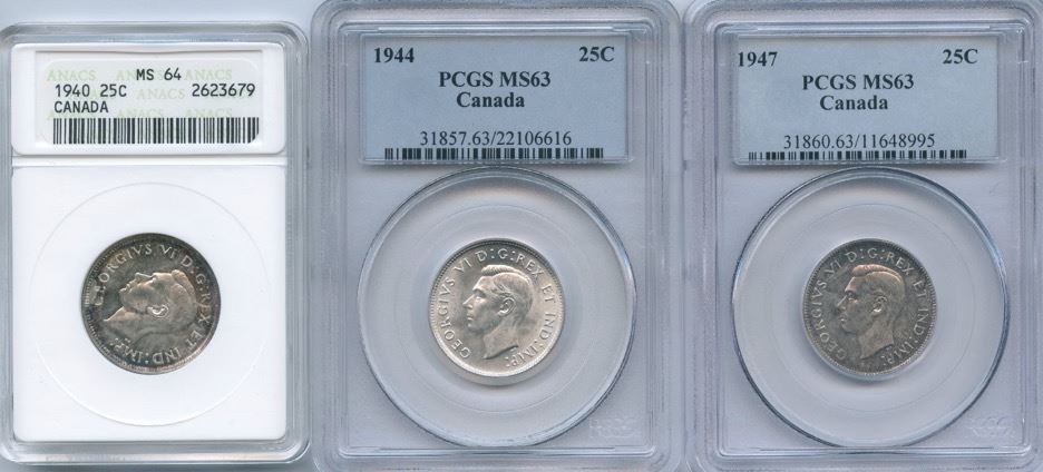 Includes: 1940 ANACS MS64. 1944 PCGS MS63. 1947 PCGS MS63. 3 pcs.