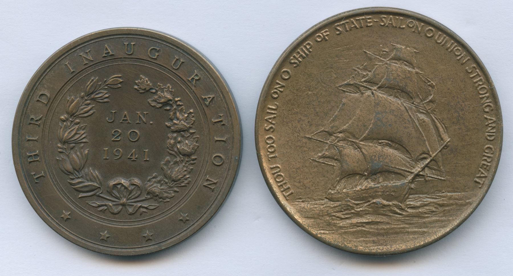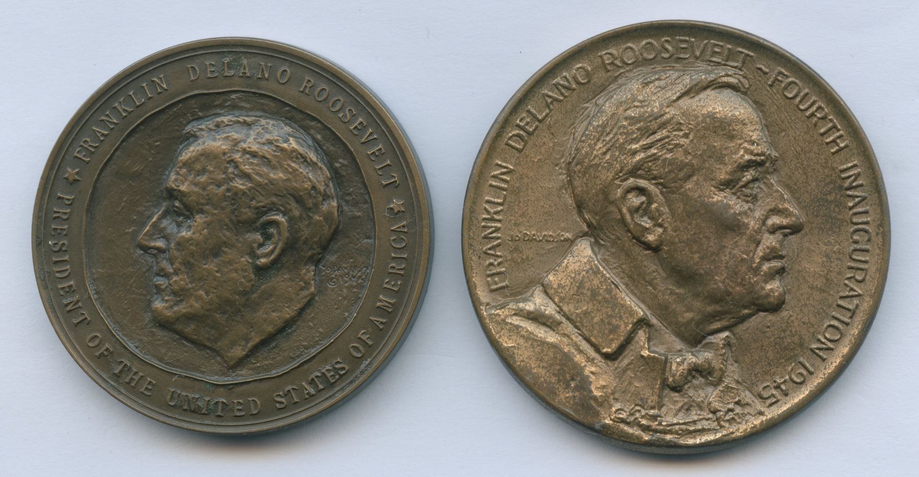 Gilt bronze, 42mm, around the rim starting at 8:00 reads THIRD INAUGURATION. Second medal is bronze, 45mm, surrounded by the legend FRANKLIN ROOSEVELT - FOURTH INAUGURATION 1945. 2 pcs.
