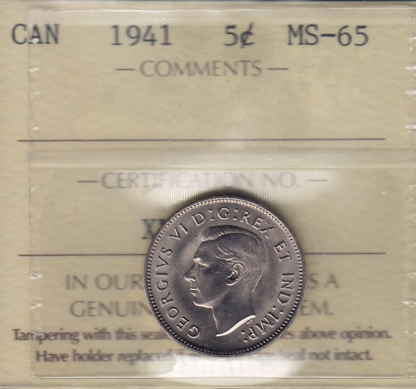 1941 Five Cent. ICCS MS-65. Perfect example for an elite collection.