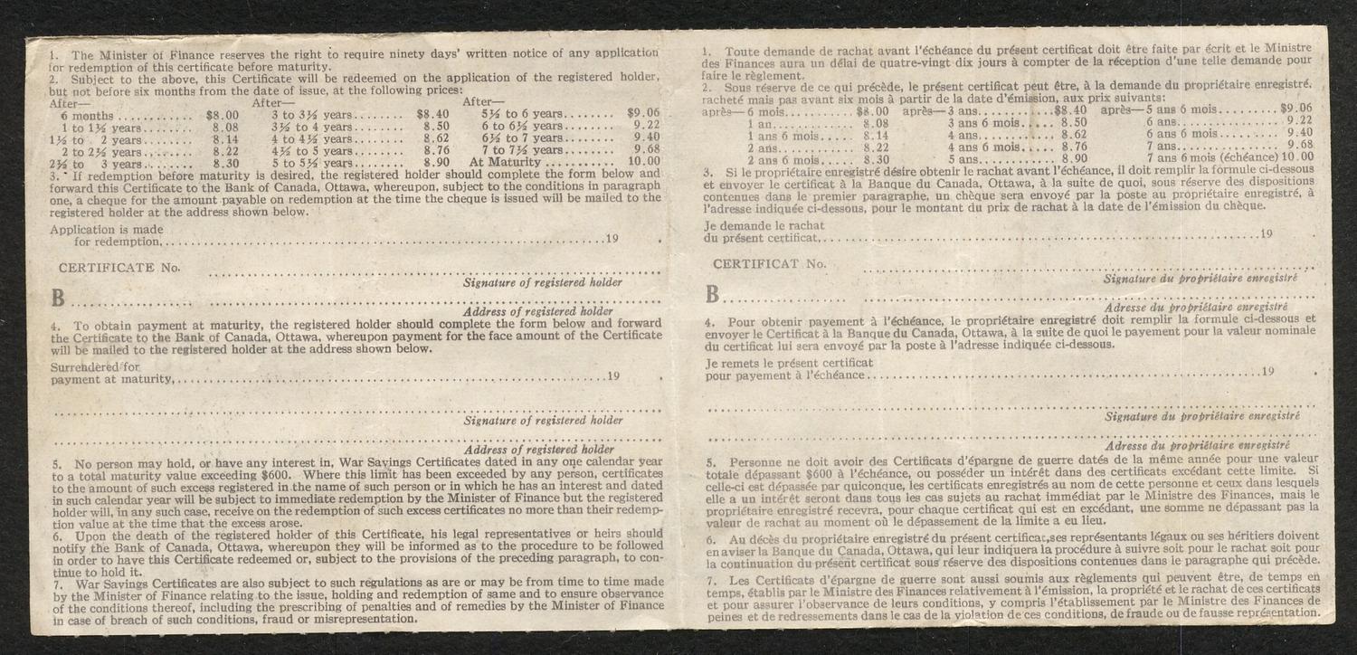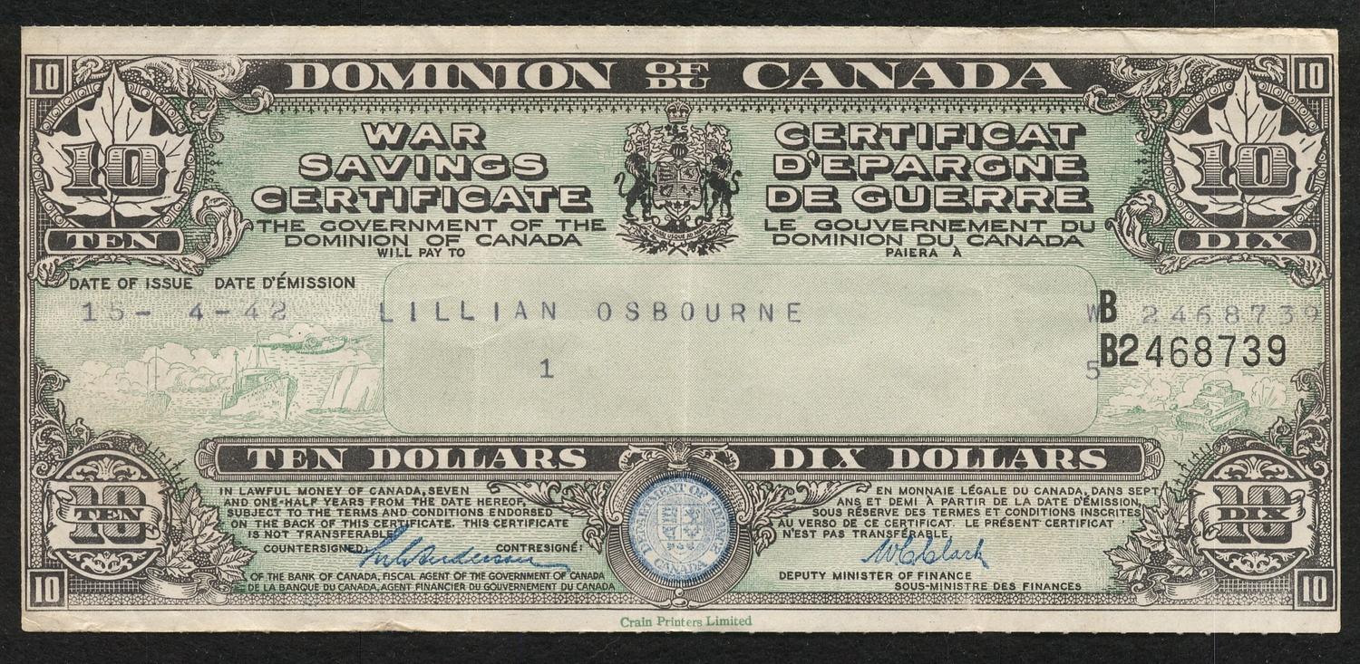Dated 15-4-42. Issued by The Government of The Dominion of Canada, Will Pay To "Lillian Osborne". S/N B2468739.