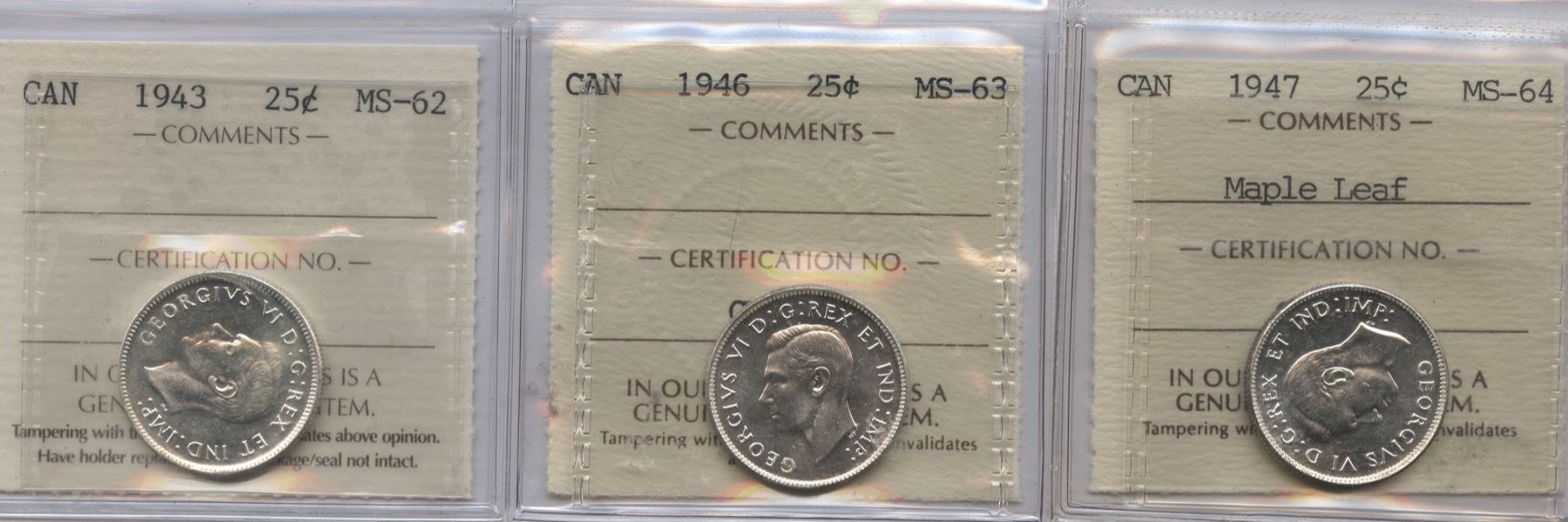 ICCS MS-62, MS-63 & MS-64. 3 pcs.