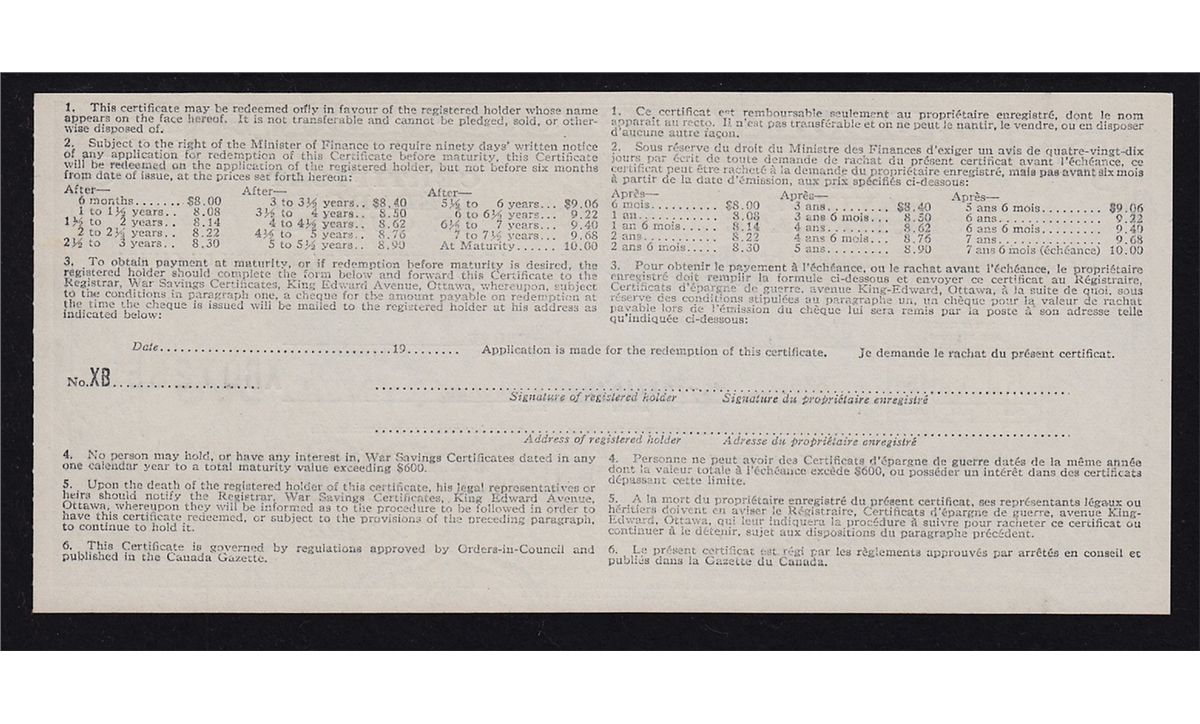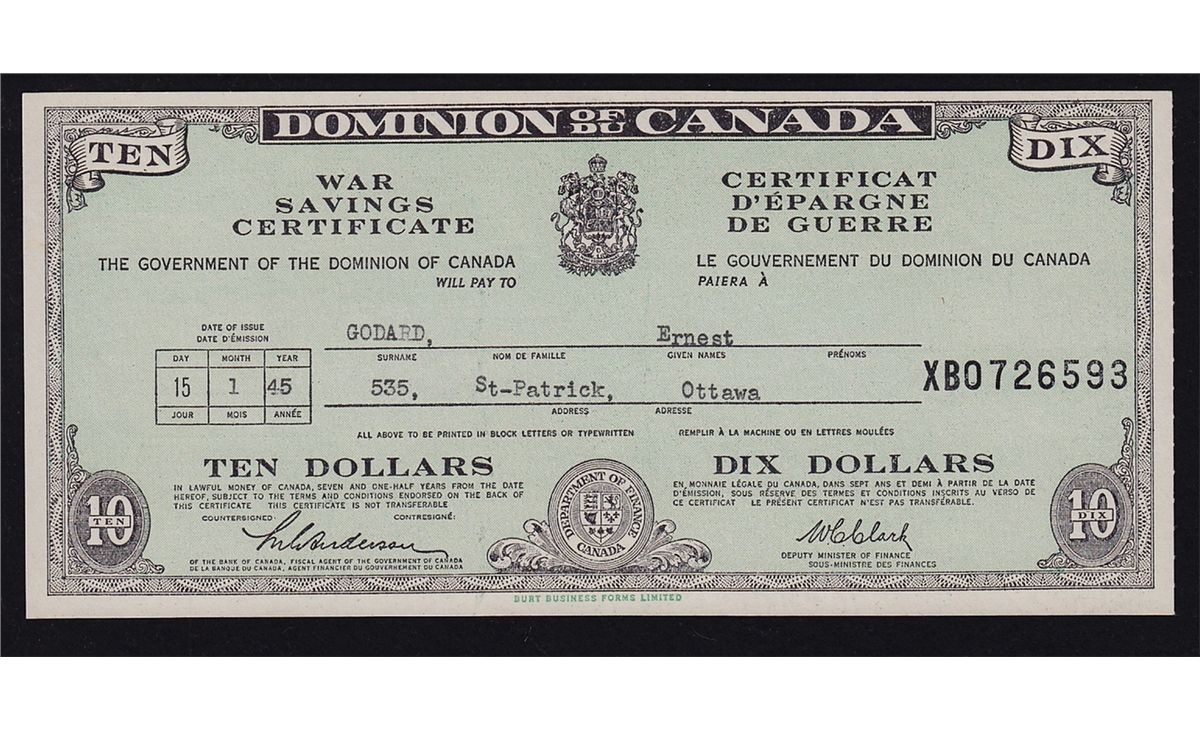 1945 Dominion of Canada War Savings $10 Certificate. - AU-Unc.