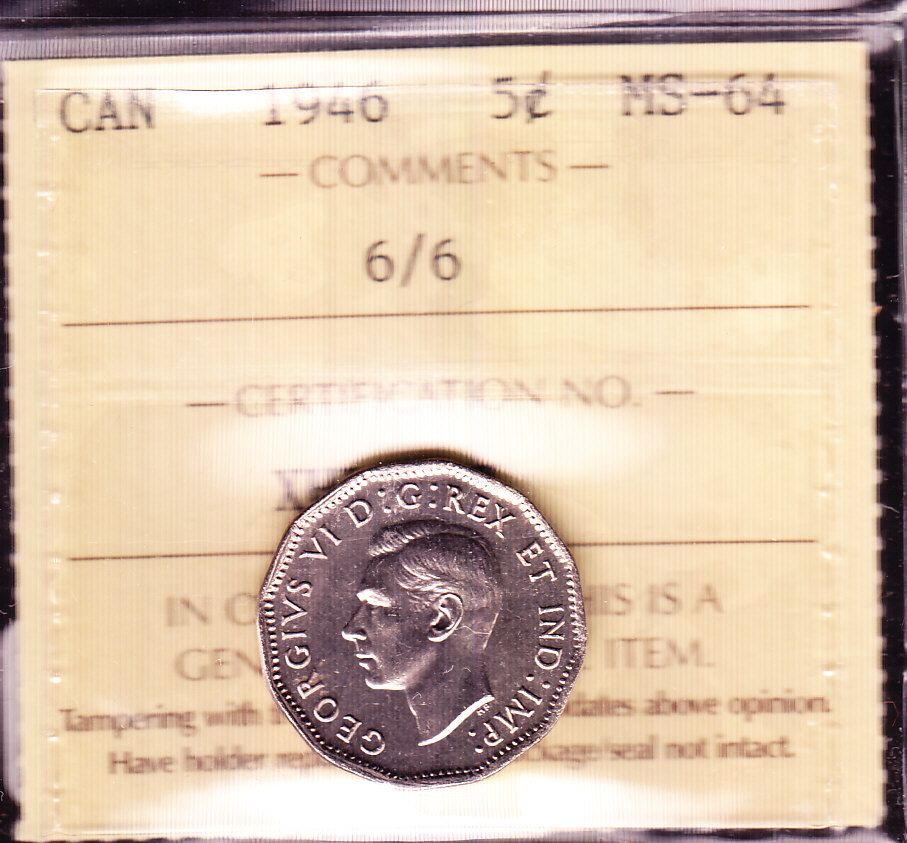 1946 Five Cent - ICCS MS-64. 6/6 Variety.