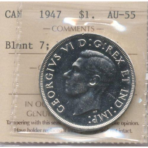 1947 Candadian One Dollar Blunt 7 ICCS AU-55 Repunched 7<BR><BR>Blunt 7, Repunched 7 variety