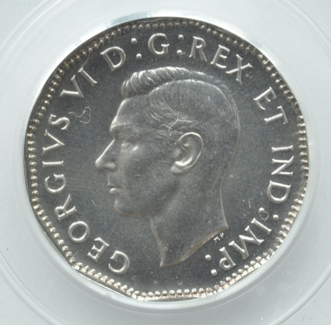 1947 Five Cent CCCS SP-65, Maple Leaf, Struck through wire.