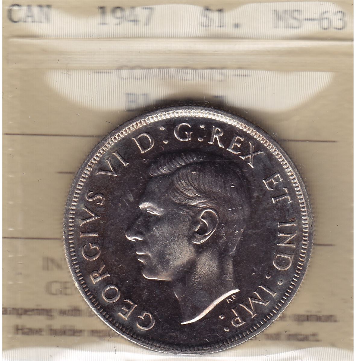 1947 Silver Dollar ICCS MS-63. Blunt 7.