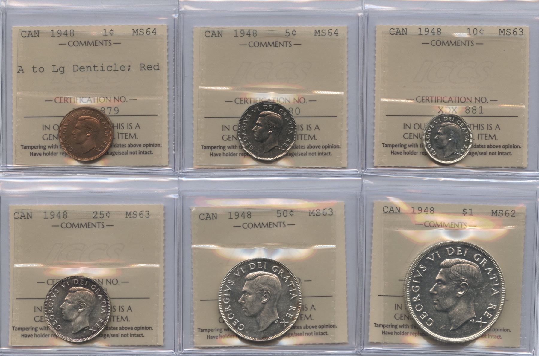 Rare set includes: One Cent MS64, A to Denticle, Red; Five Cents MS64; Ten Cents MS63; Twenty-Five Cents MS63; Fifty Cents MS63; Silver Dollar MS62. 6 Pcs.