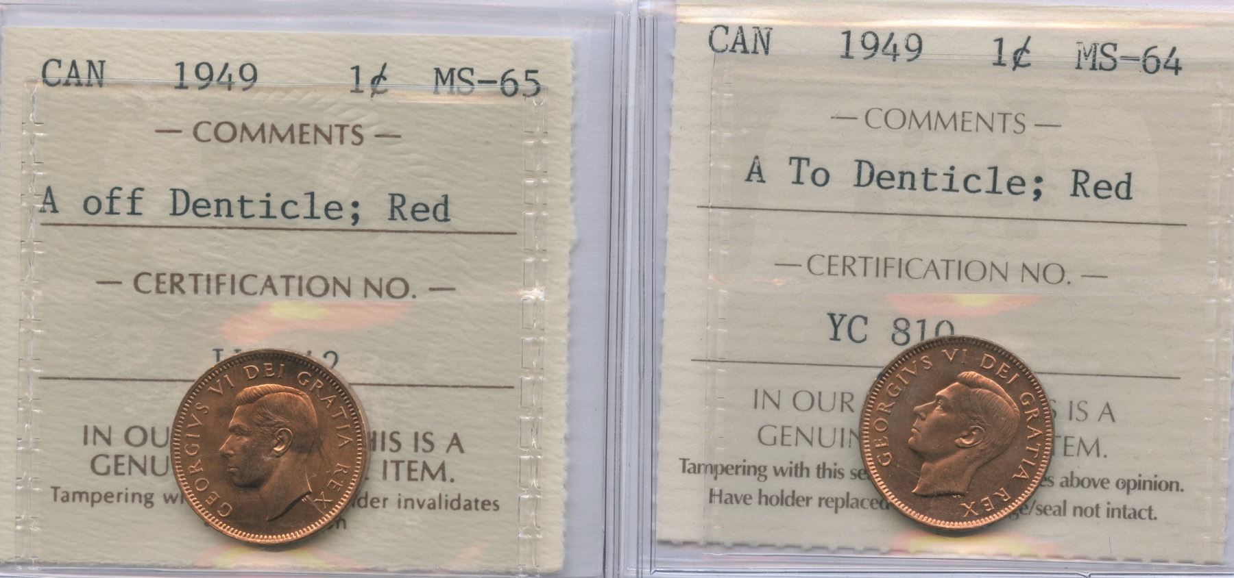Includes: 1949 MS-65. A off Denticles; Red. 1949 MS-64. A to Denticle; Red. 2 pcs.