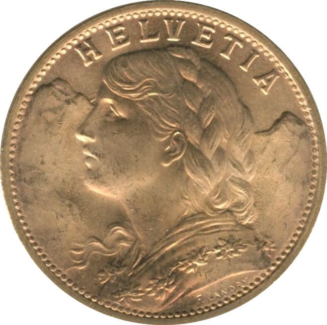 1949B Switzerland 20 Franc Gold