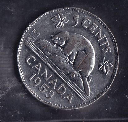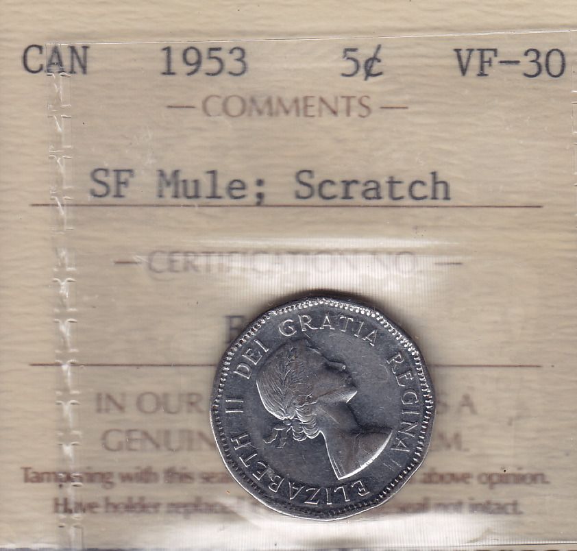 1953 Five Cent - ICCS VF-30, scratch, SF Mule.