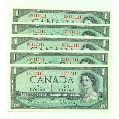 1954 Bank of Canada $1 Almost Solid Serial #'s Lot of 5 Notes<BR><BR>S/N P\M4111111, 5111111, 6111111, 7111111, 8111111 Great serial number lot, almost solid 1's, neat consecutive run
