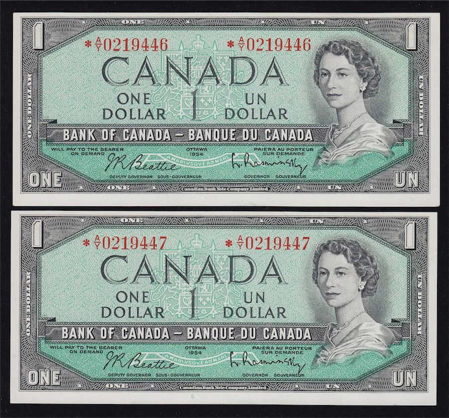 1954 Bank of Canada $1 Consecutive Pair. BC-37bA, AU-UNC, Replacement notes, S/N:*A/Y0219446-*A/Y0219447. 2 Pcs.