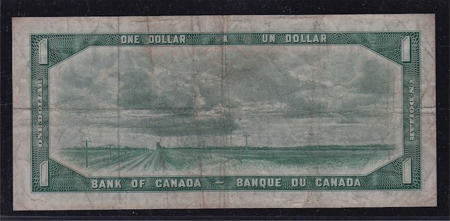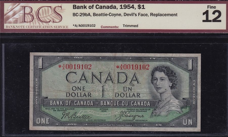 1954 Bank of Canada $1 Devil's Face. BC-29bA, BCS Fine 12, Replacement, S/N:*A/A0019102.