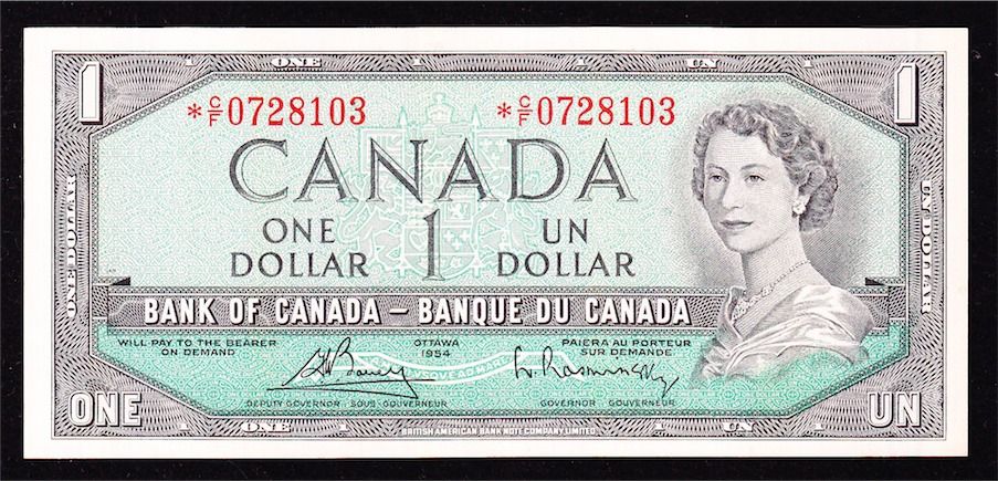 1954 Bank of Canada $1 Replacement Note - CH BC-37cA, Uncirculated. S/N:*C/F0728103.