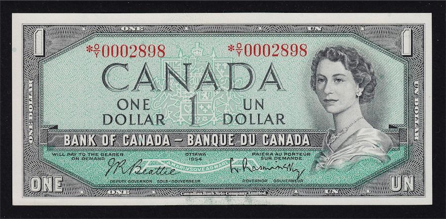 1954 Bank of Canada $1 Replacement Note - CH BC-37bA, Uncirculated. S/N:*O/Y0002898.