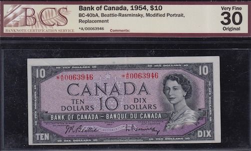 1954 Bank of Canada $10 Replacement Note - CH BC-40bA, BCS Very Fine 30 Original, S/N:*A/D0063946.