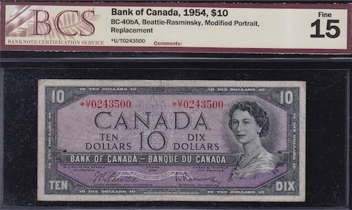 1954 Bank of Canada $10 Replacement Note - CH BC-40bA, BCS Fine 15, S/N:*U/T0243500.