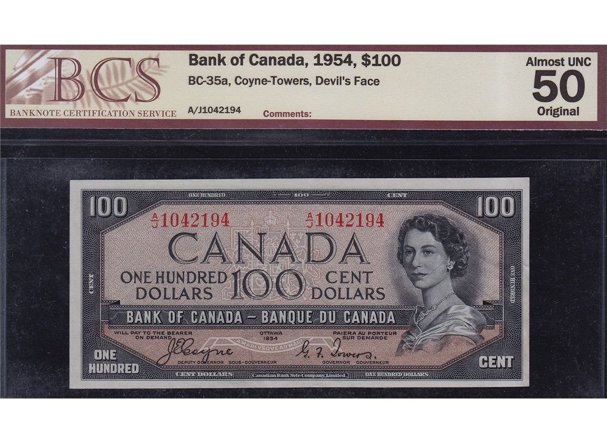 1954 Bank of Canada $100 Devil's Face - CH BC-35a, Coyne-Towers, BCS Almost Unc 50 Original, S/N:A/J1042194.