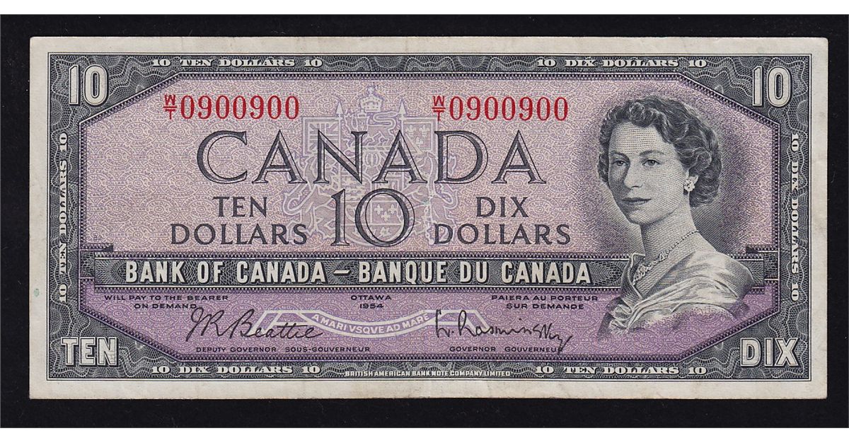 1954 Bank of Canada $10 - CH BC-40b, VF, lightly pressed, S/N:W/T0900900.