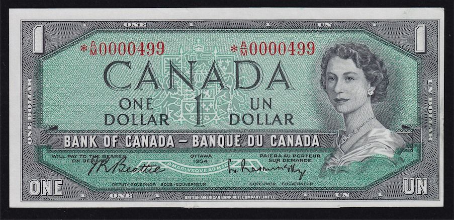 1954 Bank of Canada $1. BC-37bA-I, AU, Replacement note, S/N:*A/M0000499.