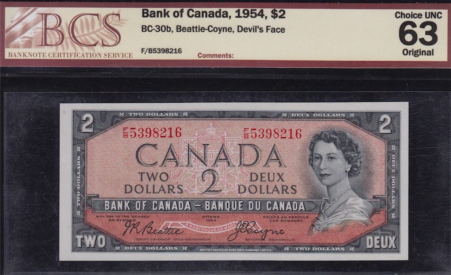 1954 Bank of Canada $2 Devil's Face. BC-30b, BCS Choice UNC 63, S/N:F/B5398216.
