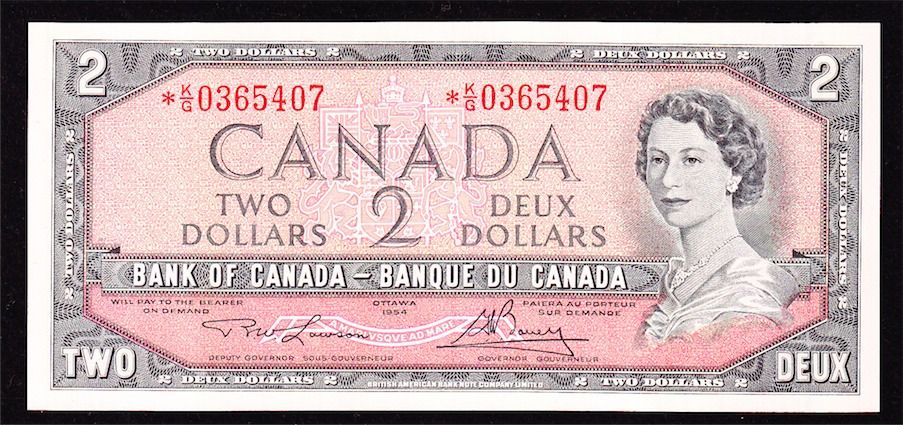 1954 Bank of Canada $2 Replacement Note - CH BC-38dA, Uncirculated, S/N:*K/G0365407.