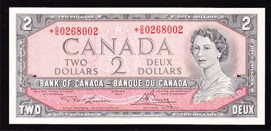 1954 Bank of Canada $2 Replacement Note - CH BC-38dA, Uncirculated, S/N:*O/G0268002.