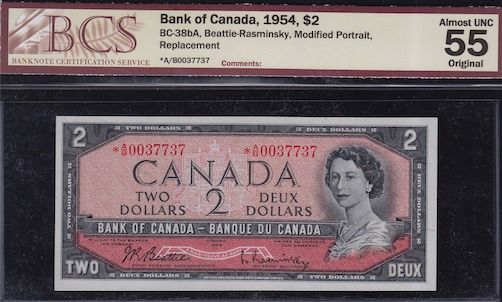 1954 Bank of Canada $2 Replacement Note - CH BC-38bA, BCS Almost Unc 55 Original, S/N:*A/B0037737.