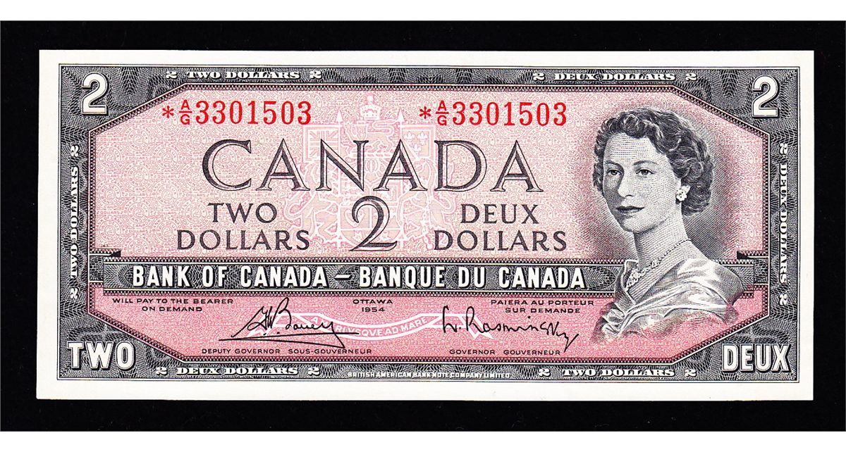 1954 Bank of Canada $2 Replacement Note - CH BC-38cA, Unc, S/N:*A/G3301503.