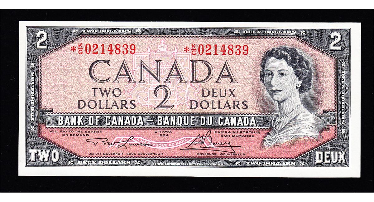 1954 Bank of Canada $2 Replacement Note - CH BC-38dA, Unc, pressed, S/N:*K/G0214839.