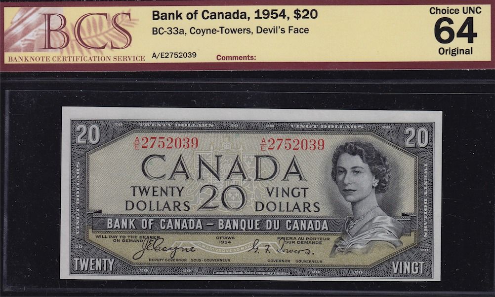1954 Bank of Canada $20 - CH BC-33a Devil's Face. BCS Original Choice UNC64. S/N:A/E2752039.
