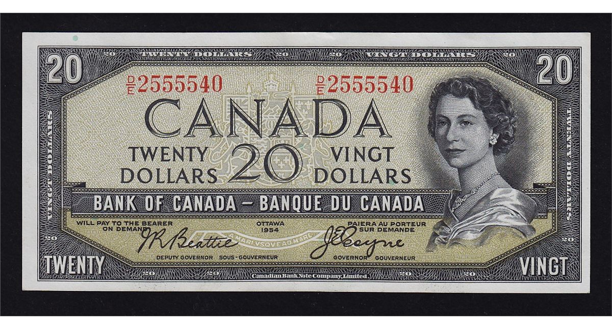 1954 Bank of Canada $20 Devil's Face - CH BC-33b, Unc, S/N:D/E2555540.