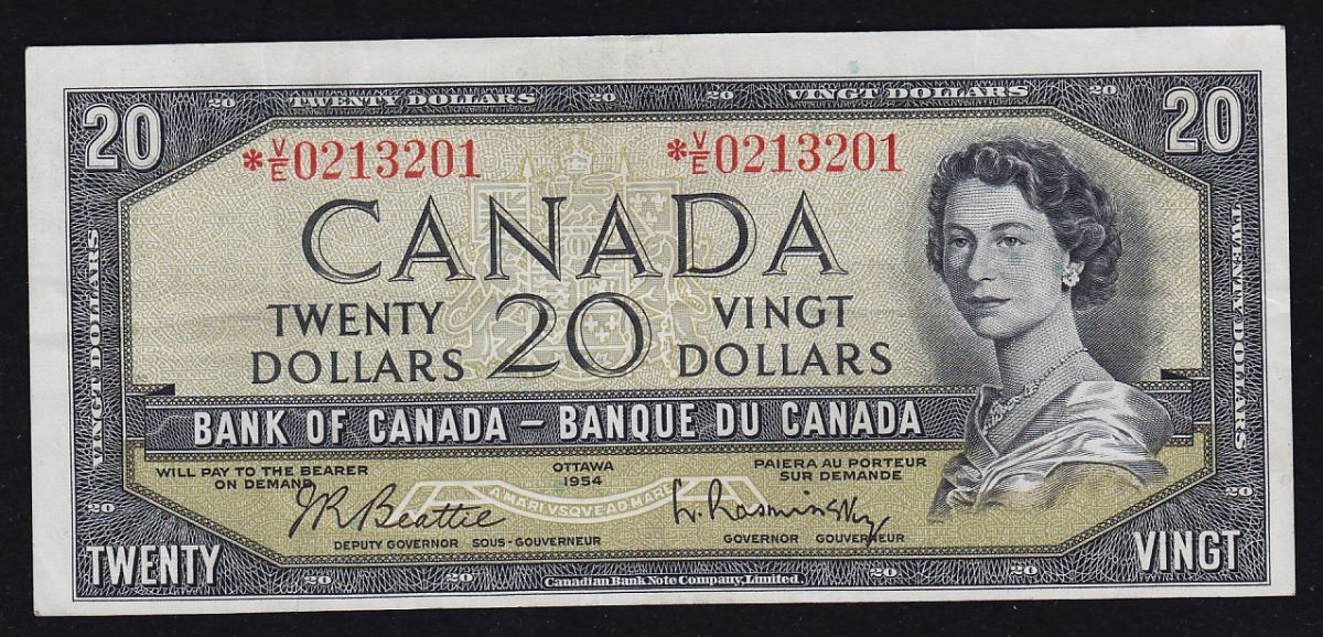 1954 Bank of Canada $20 Replacement - BC-41bA. Rarely seen *V/E prefix. Nice original VF. S/N: *V/E0213201.
