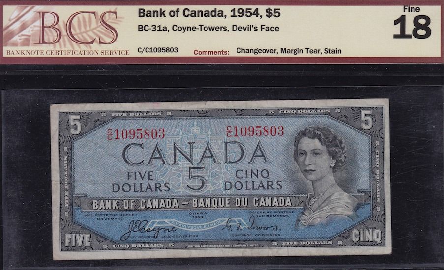 1954 Bank of Canada $5 & $10 Devil's Face Banknotes. Includes: BC-31a, BCS Fine 18, S/N:C/C1095803; BC-32a, BCS Fine 18, S/N:D/D1788226. 2 Pcs.