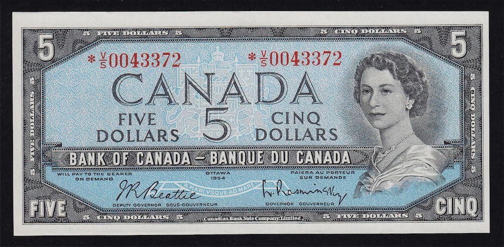 1954 Bank of Canada $5 - CH BC-39bA Replacement Note. UNC. S/N:*V/S043372.