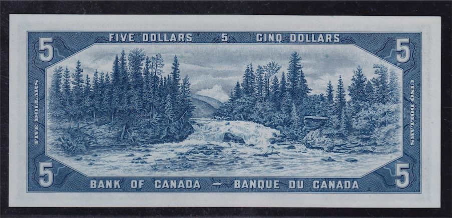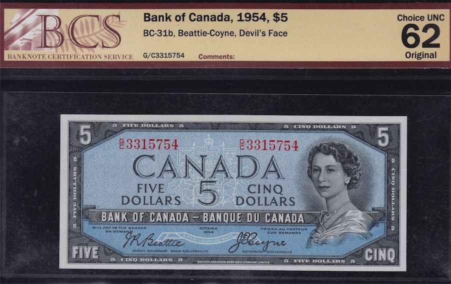 1954 Bank of Canada $5 Devil's Face Consecutive Pair. Includes: BC-31b, both BCS Choice UNC 62 Original, S/N:G/C3315754-G/C3315755. 2 Pcs.