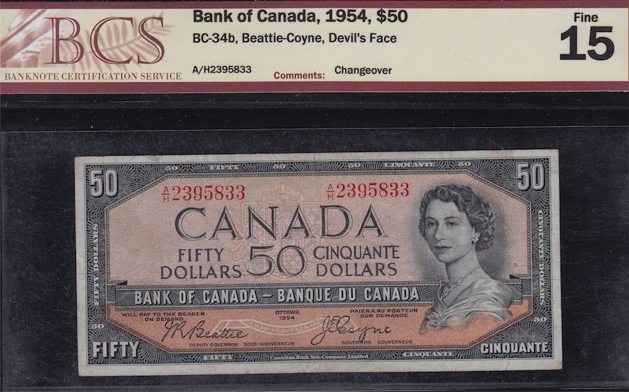1954 Bank of Canada $50 Devil's Face. BC-34b, BCS Fine 15, S/N:A/H2395833.