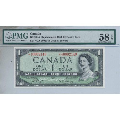 1954 Bank of Canada Devil's Face $1 Replacement Note PMG<BR><BR>Cat #BC-29aA PMG Graded Choice about uncirculated 58 EPQ, nice rare original note!