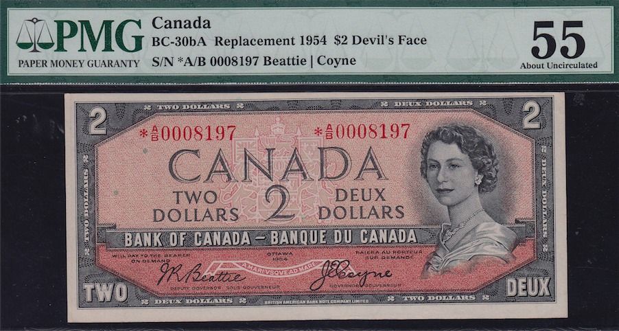 1954 Bank of Canada Devil's Face Replacement $2. BC-30bA. PMG AU-55, rare in any condition. S/N:*A/B0008197.