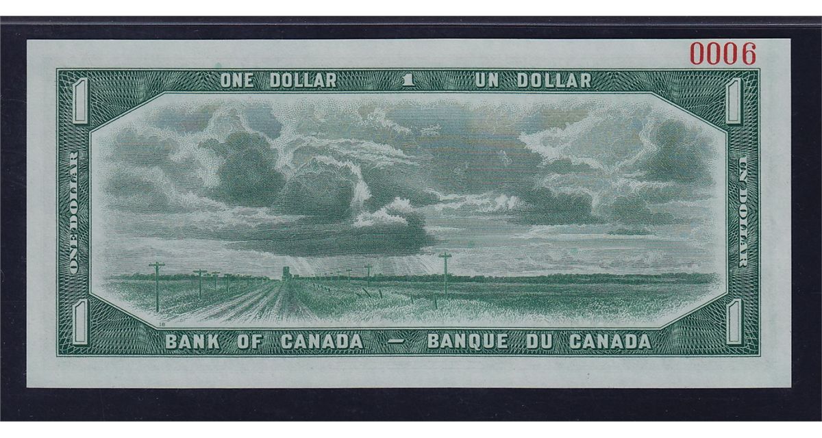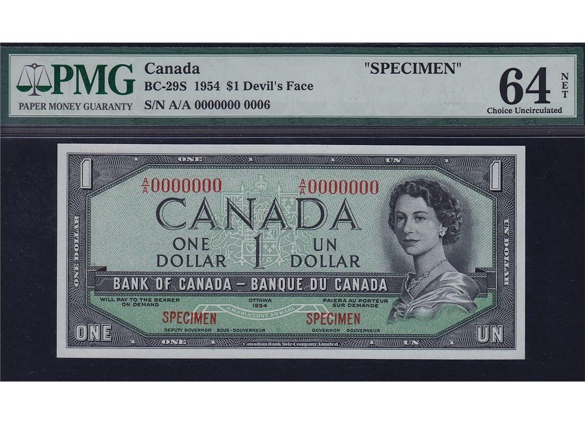 1954 Bank of Canada Devil's Face Specimen $1 - CH BC-29S, PMG Choice Uncirculated 64 NET, previously mounted - typical, 9 pieces were issued, this is #0006. S/N:A/A0006000.