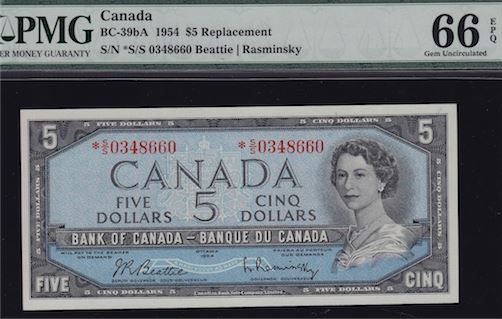 1954 Bank of Canada Five Dollars Replacement - CH BC-39bA. PMG Gem Unc 66 EPQ. S/N: *S/S0348660.