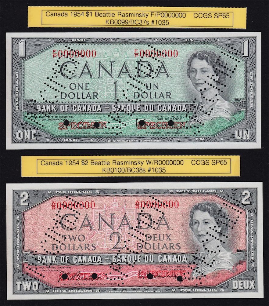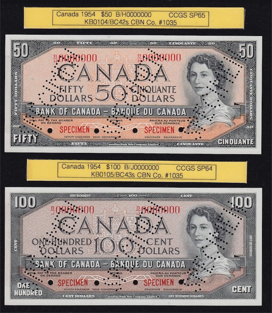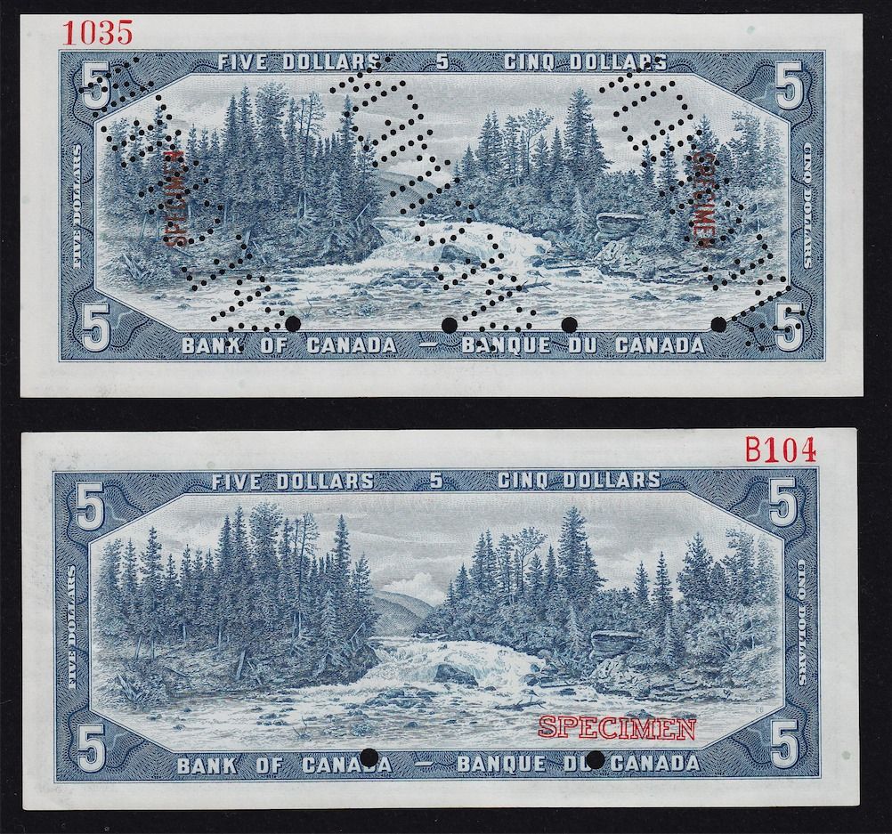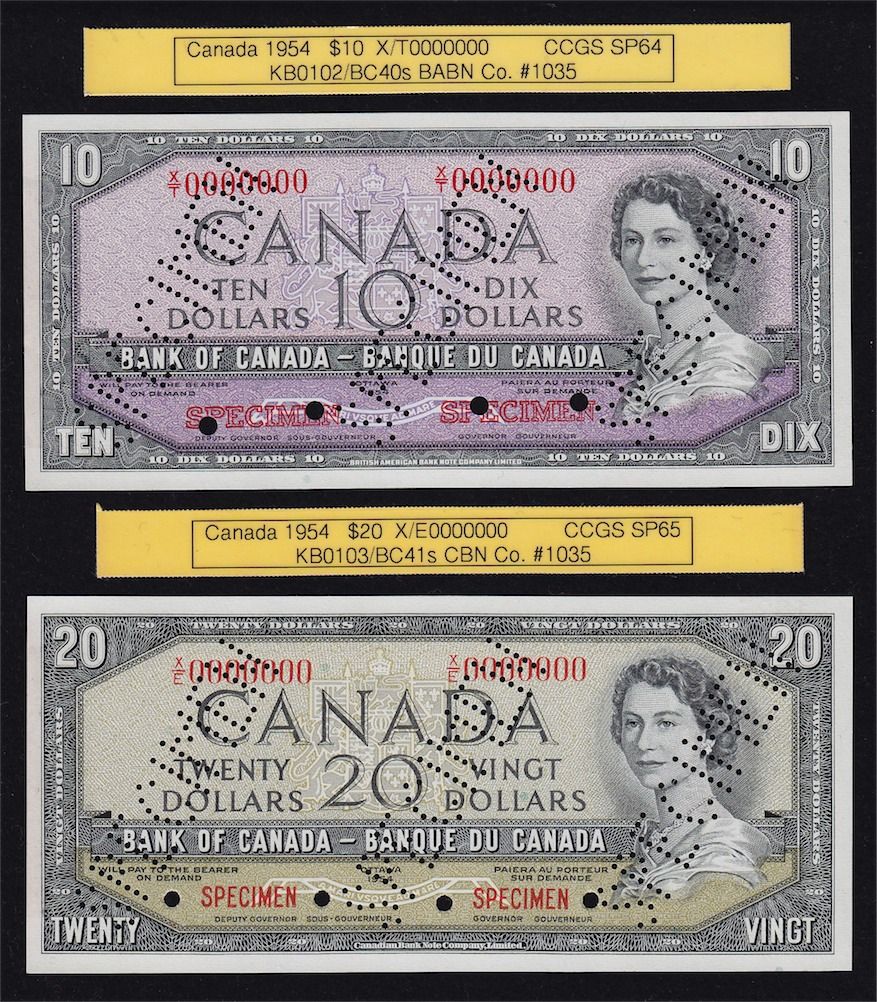 1954 Bank of Canada Modified Portrait Specimen Set (large Heading) - Perforated three times diagonally, these specimens are of choice quality with superb colours, set number 1035. It also includes an extra $5 note without perforations, number B104. This set is more difficult to obtain than the more popular devil's face variety. Only 12 sets were available at the time of sale. 8 Pcs.