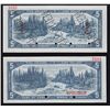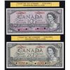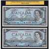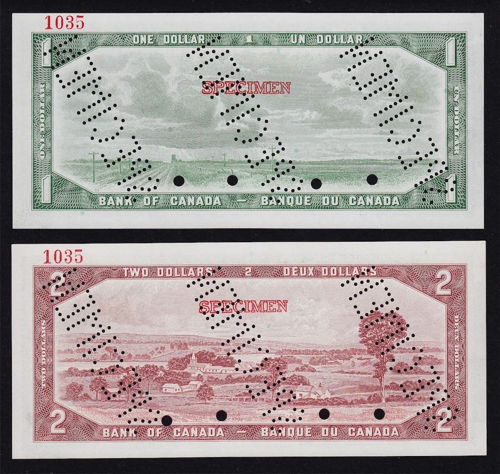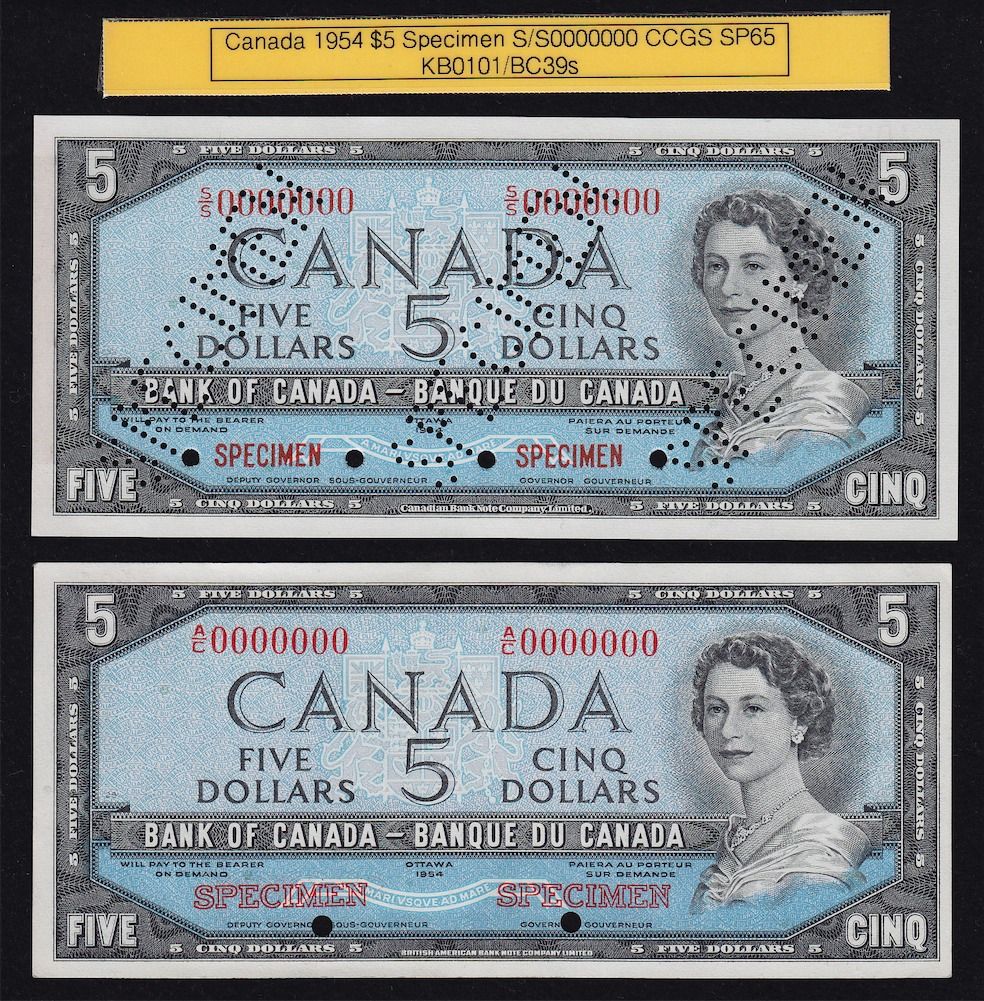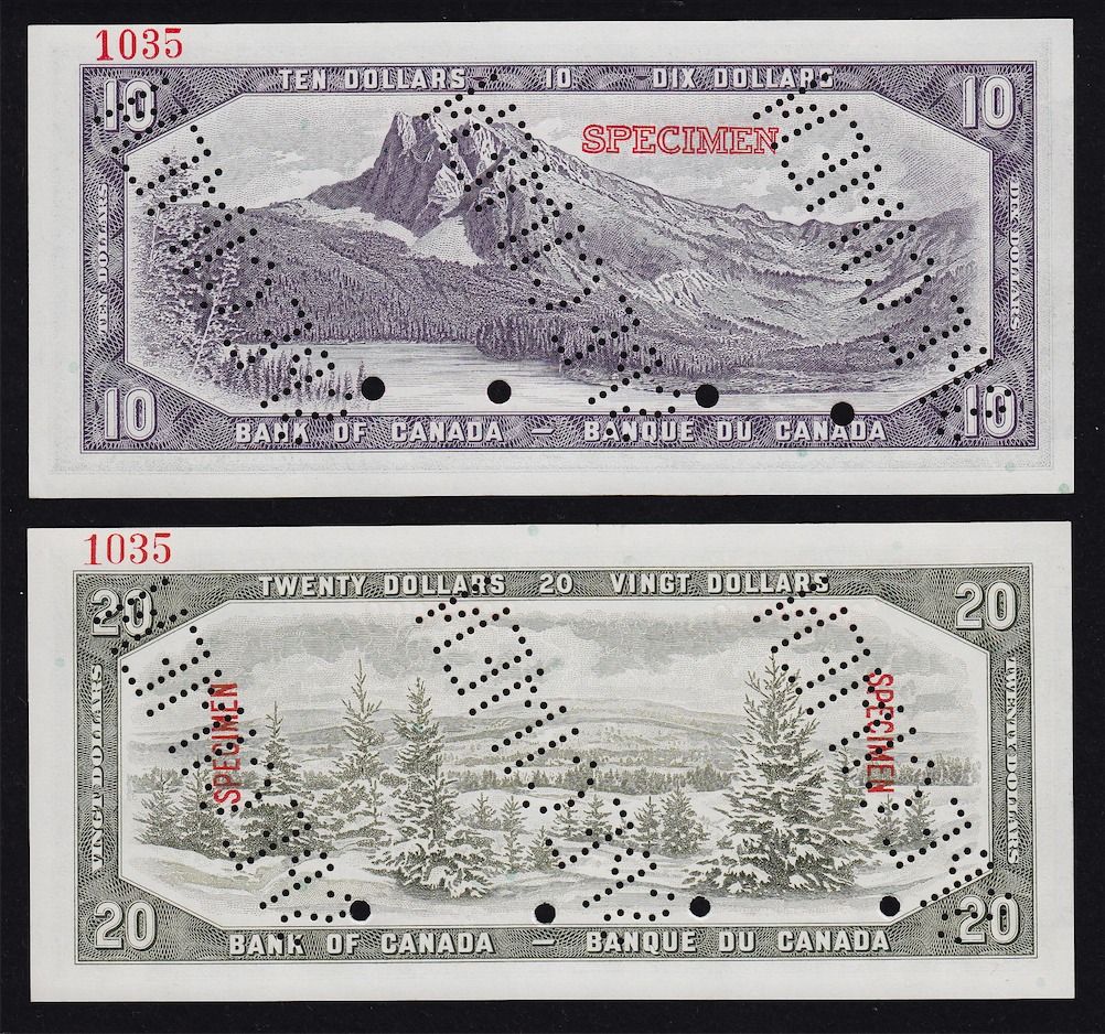 1954 Bank of Canada Modified Portrait Specimen Set (large Heading) - Perforated three times diagonally, these specimens are of choice quality with superb colours, set number 1035. It also includes an extra $5 note without perforations, number B104. This set is more difficult to obtain than the more popular devil's face variety. Only 12 sets were available at the time of sale. 8 Pcs.