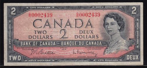 1954 Bank of Canada Two Dollars Test Note - CH BC-38bT. CCCS F-15. 12 notes on registry. S/N: G/R0002439.