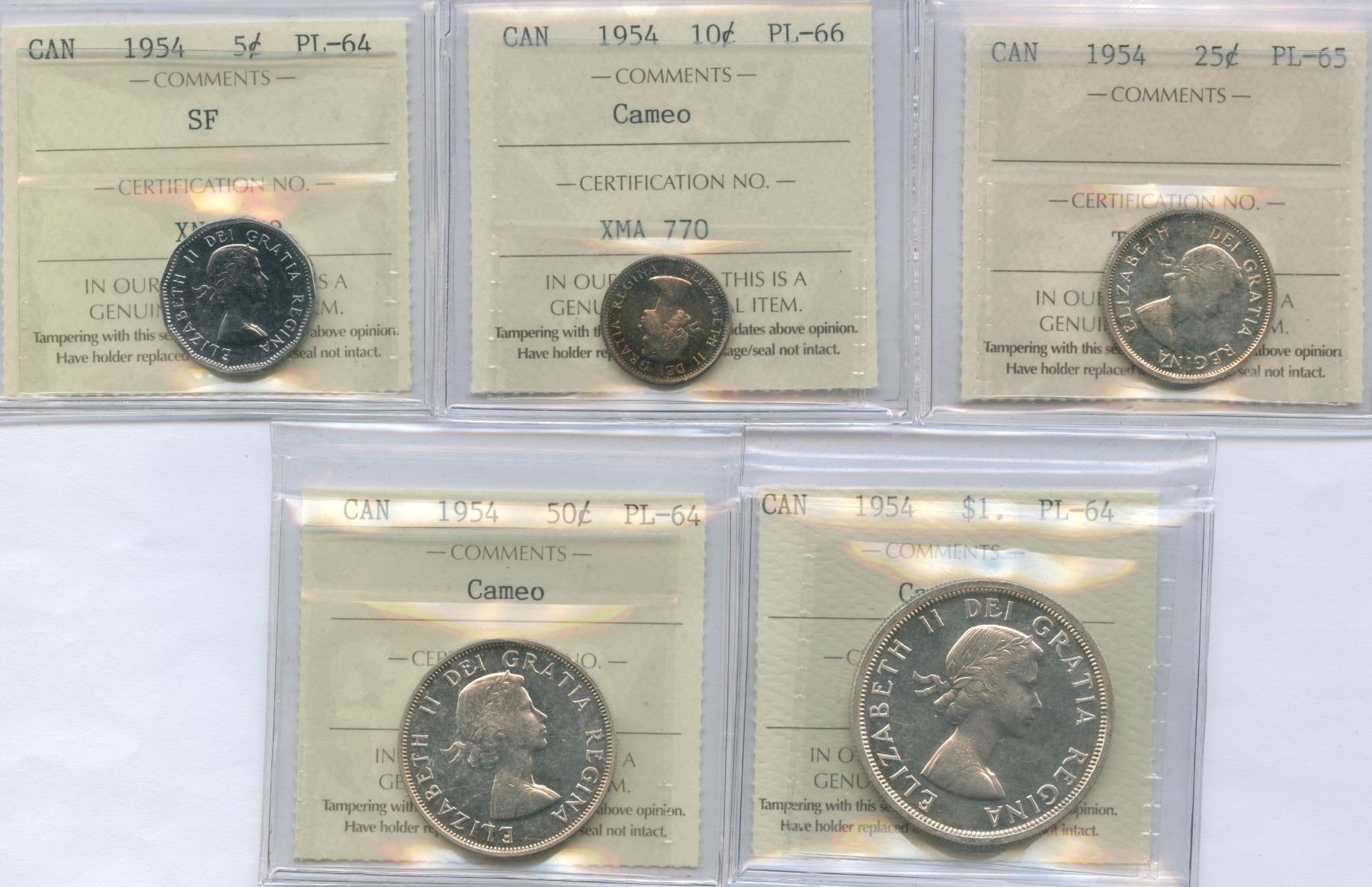 Includes: Five Cents, PL-64; SF. Ten Cents, PL-66; Cameo. Twenty-Five Cents, PL-65. Fifty Cents, PL-64; Cameo. Silver Dollar, PL-64; Cameo. Missing only the penny. 5 pcs.